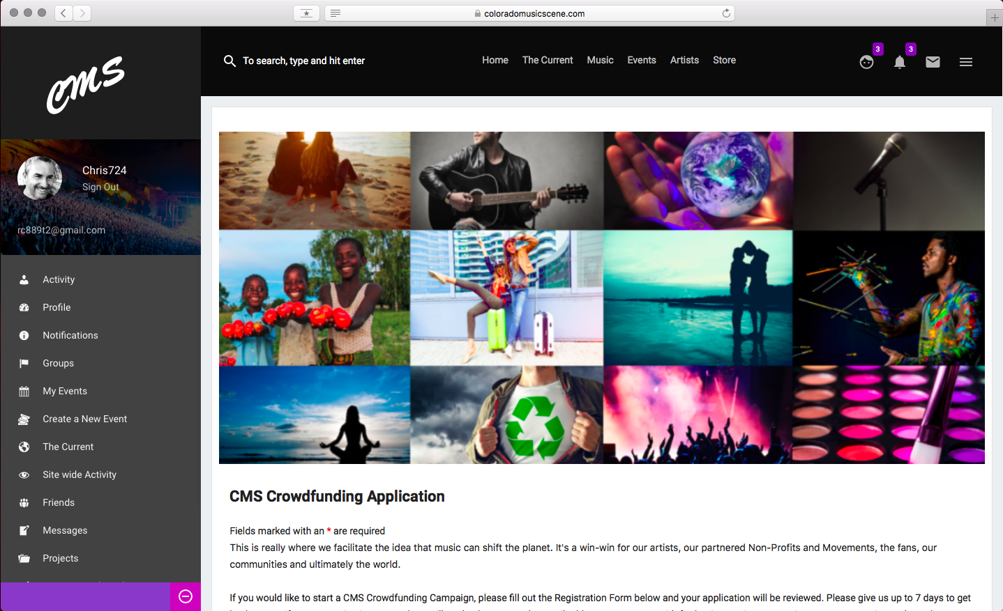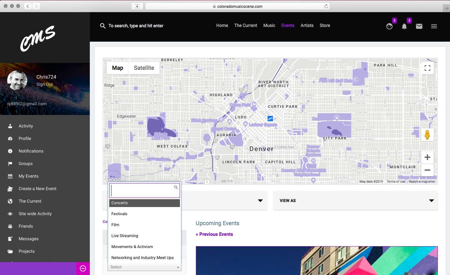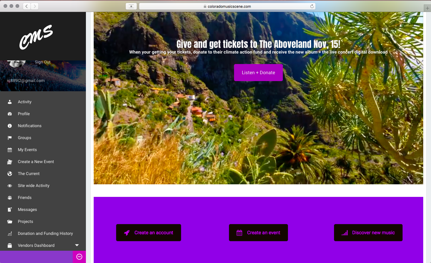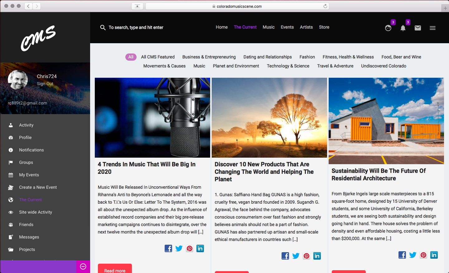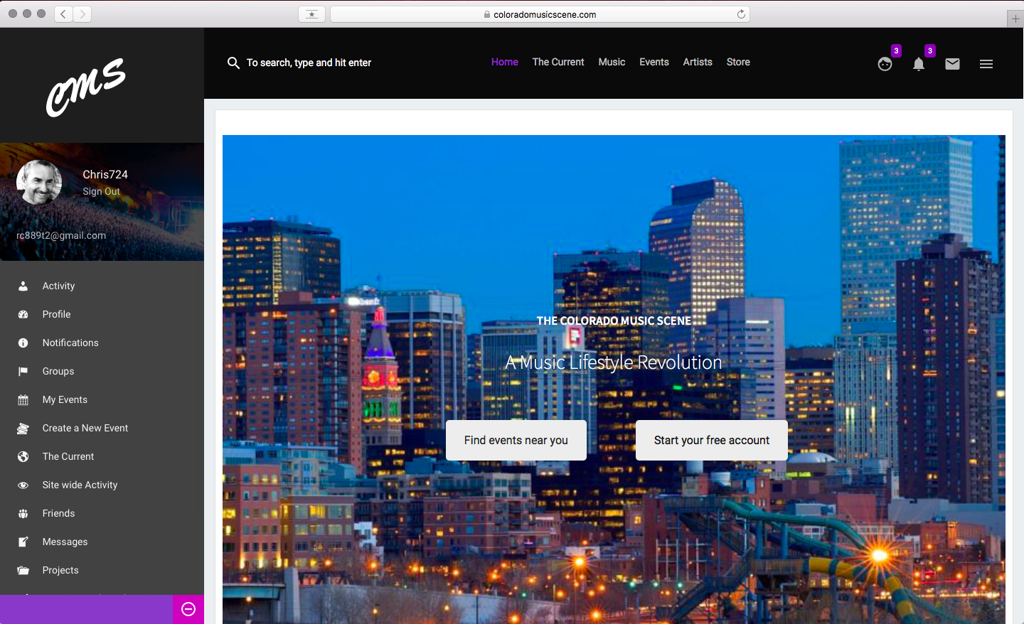 CMS ( Colorado Music Scene ) will be the first GMS brand to launch and will feature the first version of our music + lifestyle app. We want to give fans the ultimate experience with this. The app allows users to discover not just well known artists, but local up and coming artists. Users can browse, stream and share music and live streamed shows. They can find thousands of local concerts and events, and access specially curated events and experiences produced by us and our strategic partners.